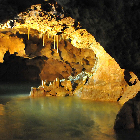 동굴내로 침투하는 지하수가 경사진 천장이나 벽면의 틈 사이를 따라 흘러내려 생성된 약12m의 대형 커튼 모양의 종유석.
